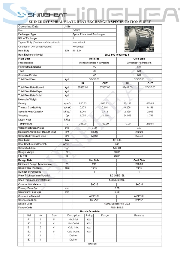 The Spiral plate heat exchanger will carry out special chemical solution of “Monoglycerides and Glycerine” heat exchanger with “Glycerine and Palmstearin”.