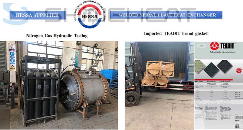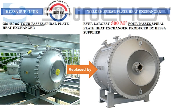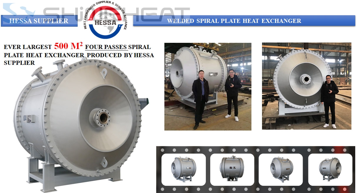 Increase transfer area from 480m2 to 500m2, so it is the ever-largest Four-Pass Spiral Plate Heat Exchanger we made.PED 2014/68/EU certified design Production by HESSA supplier and SHINEHEAT