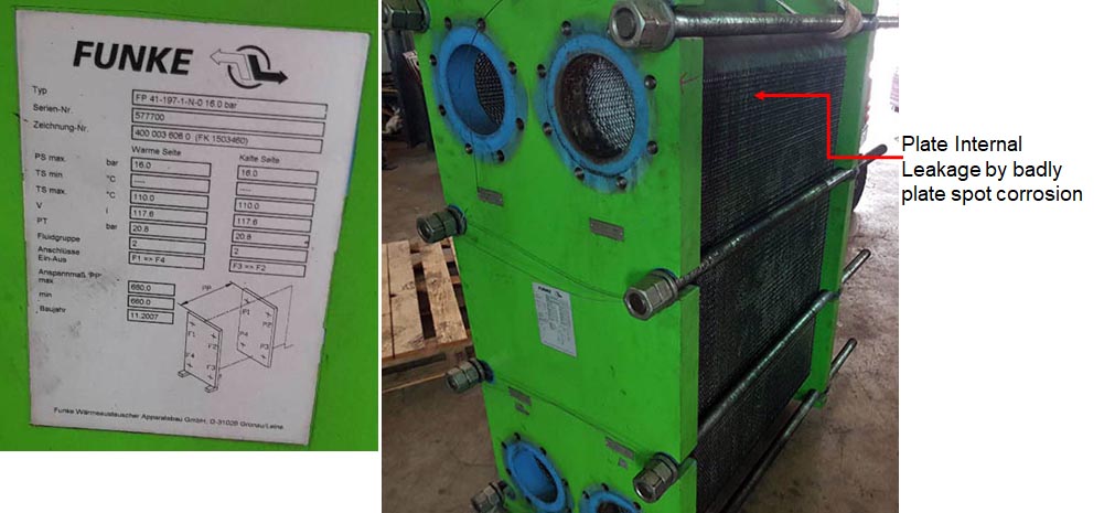 In view of badly Spot Corrosion on plates, the FUNKE plate heat exchanger suffer Internal Leakage. So all the amount plates need to replace by brand new identical Plates.