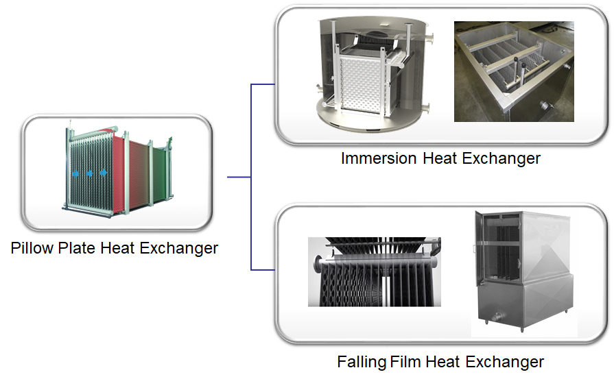 As to different applications, Pillow Plate Heat Exchanger also could divided into Immersion Heat Exchanger and Falling Film Heat Exchanger.