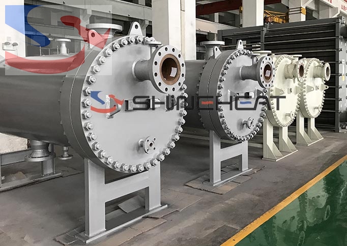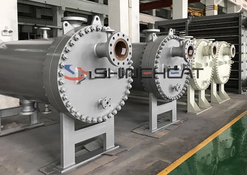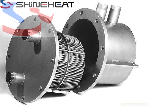 The plate and shell heat exchanger adopts advantage of plate heat exchanger, meanwhile making up for shortcoming of shell and tube heat exchanger. The oval transfer plate combine with shell distribute the stress evenly to be more suitable for operation under changing temperature. At the same time, to provide compact size, high efficiency, and high temperature resistance and so on.