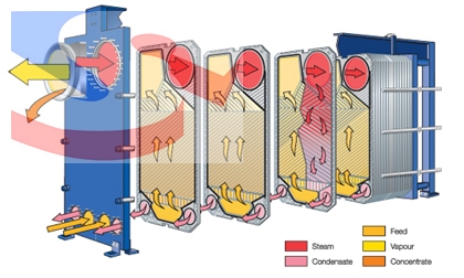 The heat transfer area of a gasketed plate-and-frame heat exchanger consists of a series of corrugated plates, assembled between the frame and pressure plates, which retain the design pressure. The sealing between the plates on the Evaporator alternates between laser welds and gaskets, just like Sem-Welded Plate Heat Exchanger. It has two inlet feed connections located centrally at the bottom of the frame plate and a large outlet for the vapour and concentrate at the top. The heating steam condenses in the welded channels and the evaporating product passes through the gasketed channels.